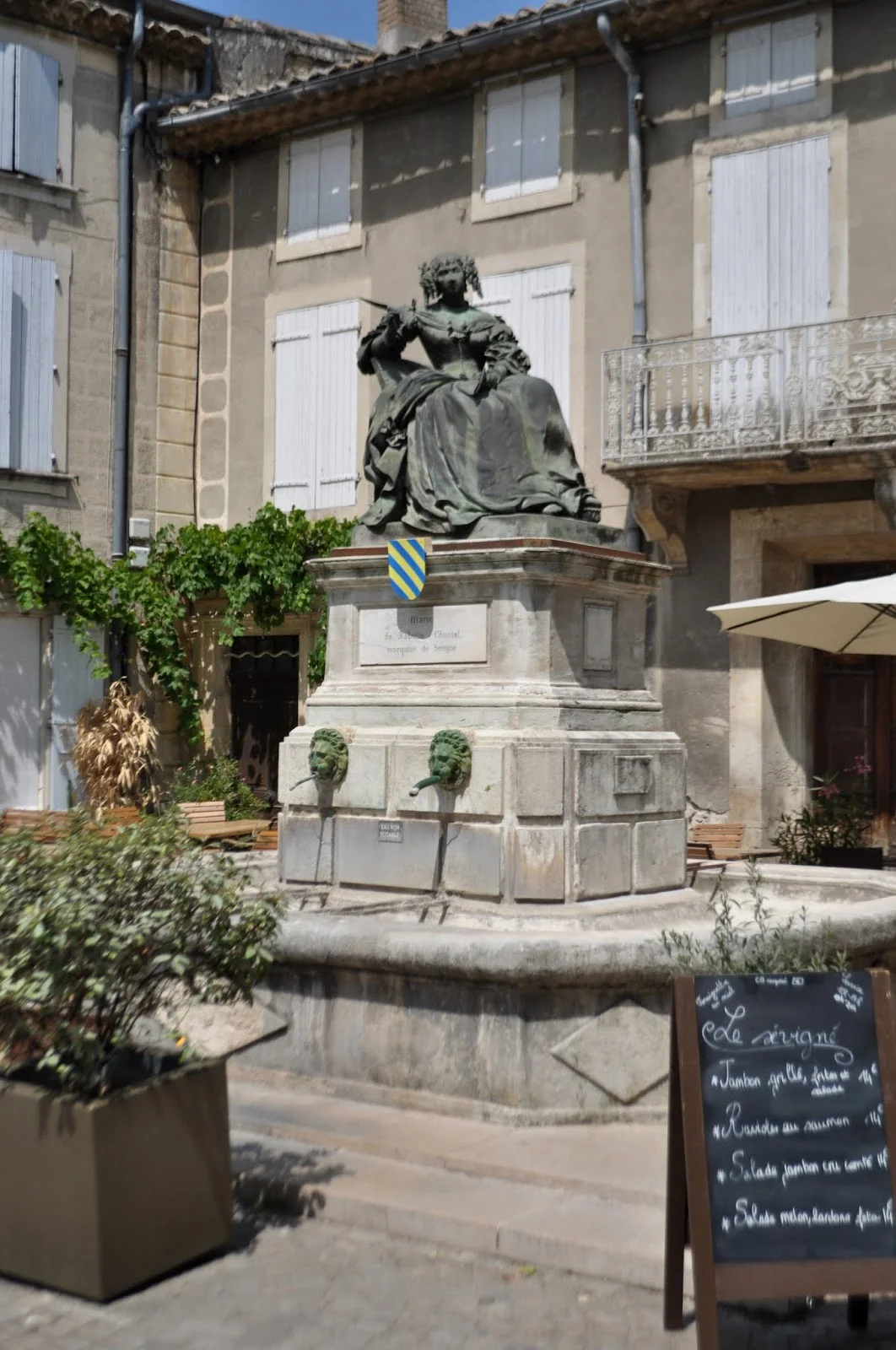 The fountain shown in the photograph below was built in 1840 at Place de l'Horloge in the center of Grignan. The statue of Madame de Sévigné was added to the fountain in 1857.