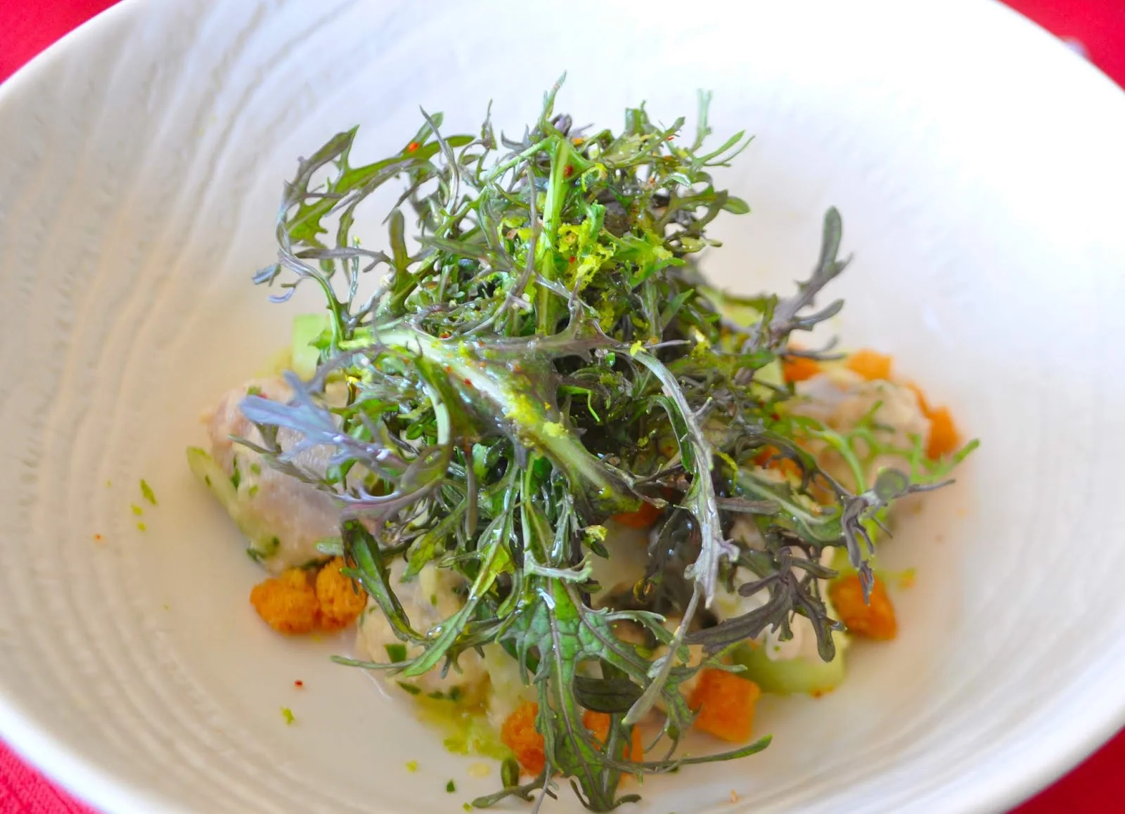 Ceviche style marinated tuna, cucumber, celery, lemon and ginger with mustard greens