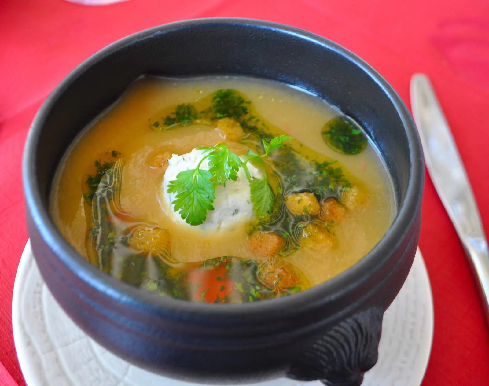 Tomato pineapple gazpacho, served with creamy herb goat cheese made in Grignan