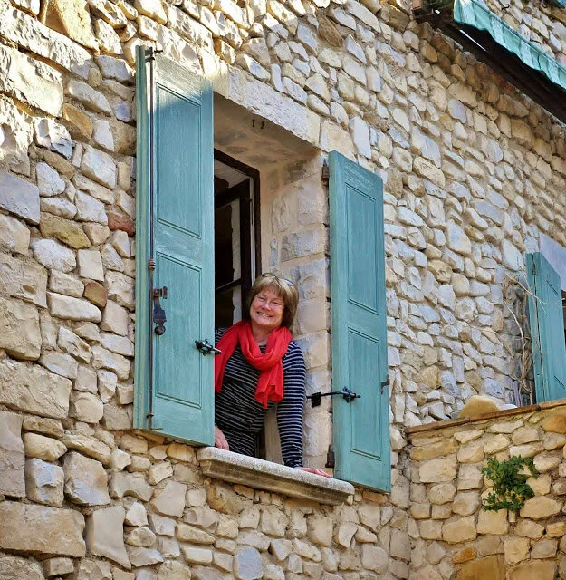 Shirley hanging out the kitchen window overlooking the intersection of Grande Rue and Rue de l'Eglise
